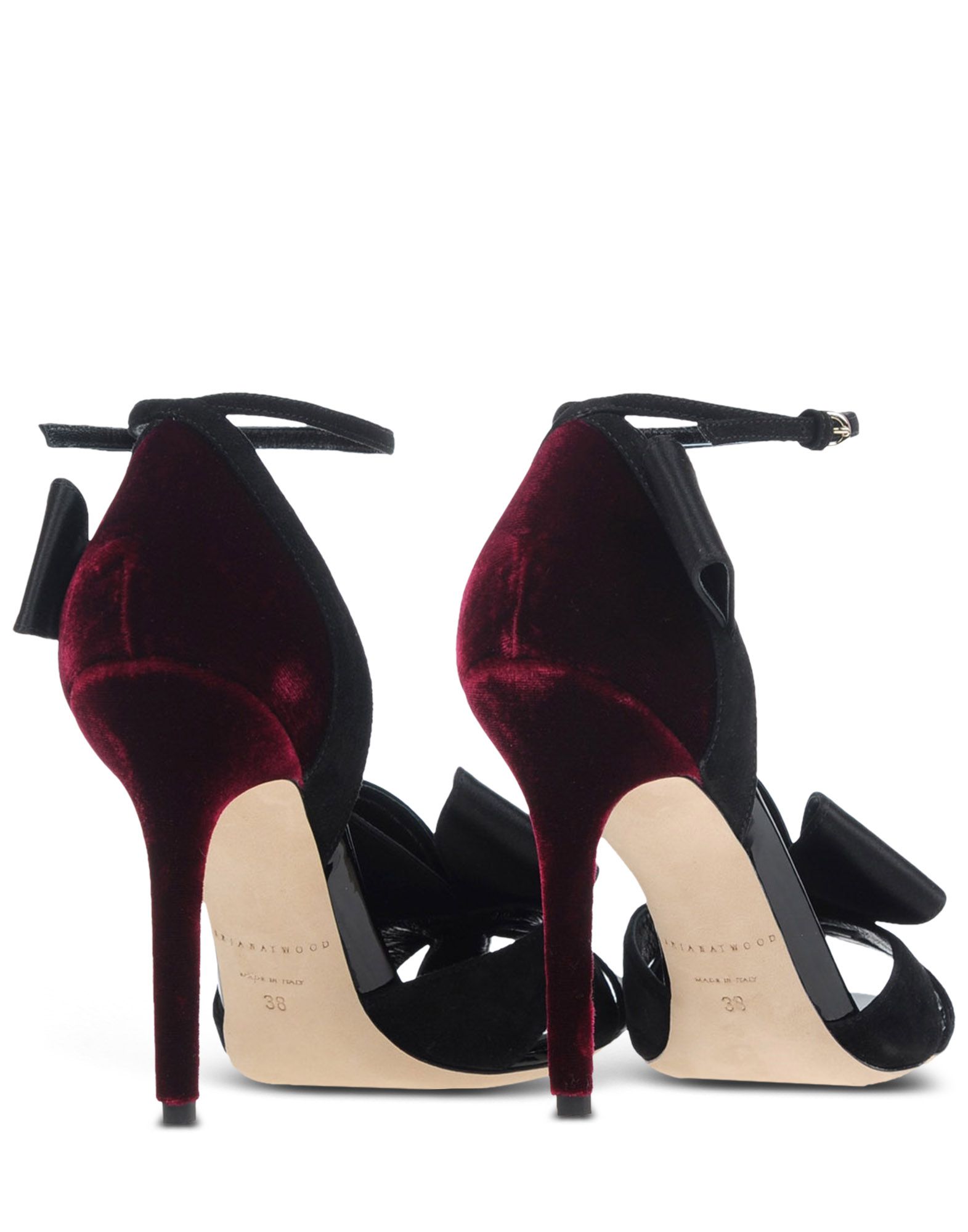 Brian Atwood deve aver ascoltato le mie preghiere, perché ha recentemente creato un paio di décolleté in suede nero con punta a mandorla scollata e cinturino alla caviglia, decorate sul retro con un fiocco piatto realizzato in velluto rosso scuro: non c’è niente di più appagante per la mia vista, ho una fissazione per le scarpe con fiocchi, queste sembrano essere state create per me!