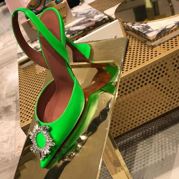 Ciò che rende questo modello speciale è il tacco, attuale firma stilistica di Amina Muaddi: la sua forma geometrica ha conquistato influencer e star in tutto il mondo, che nell’arco di pochi mesi hanno aiutato il brand a rendere le scarpe iconiche e necessarie.