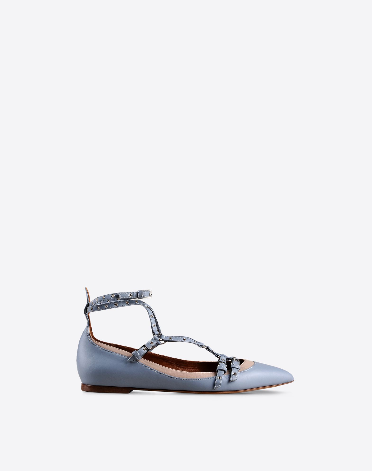 Anche in questo caso abbiamo tre altezze diverse, tacco 10 cm, tacco 6 cm e una ballerina piatta: i primi due tacchi hanno una forma vintage che contribuisce a rendere le scarpe poco moderne e che non si abbina alla decorazione frontale composta da listini sottili e hardware argentato. La ballerina è l’unico modello che mi piace, complice anche il doppio listino che decora il toe box, ma ricorda troppo la classica flat Rockstud per non sembrarne un’imitazione ben fatta; in compenso la tonalità di azzurro polvere è deliziosa.